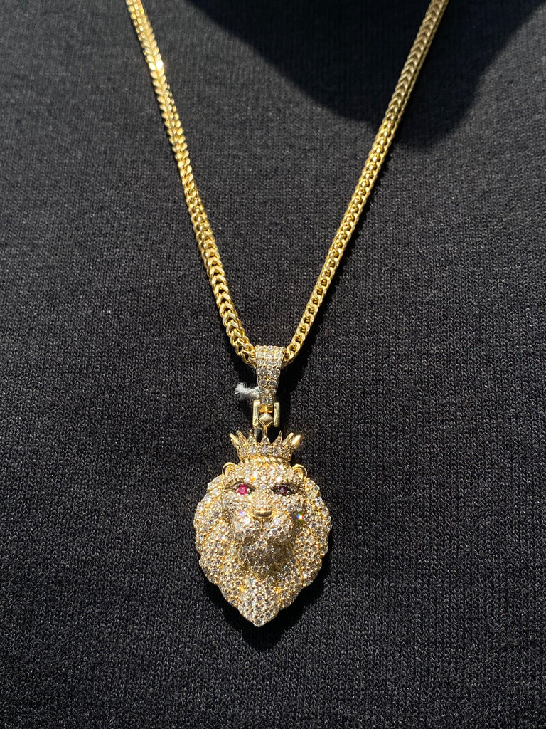 Powerful and majestic, this lion pendant combines gold, diamonds, and ruby accents to create a statement piece for men. Symbolizing courage and leadership, it is designed to stand out and make a lasting impression. Comes with guaranteed certification from our in house lab, along with custom jewelry services and resell value assurance.