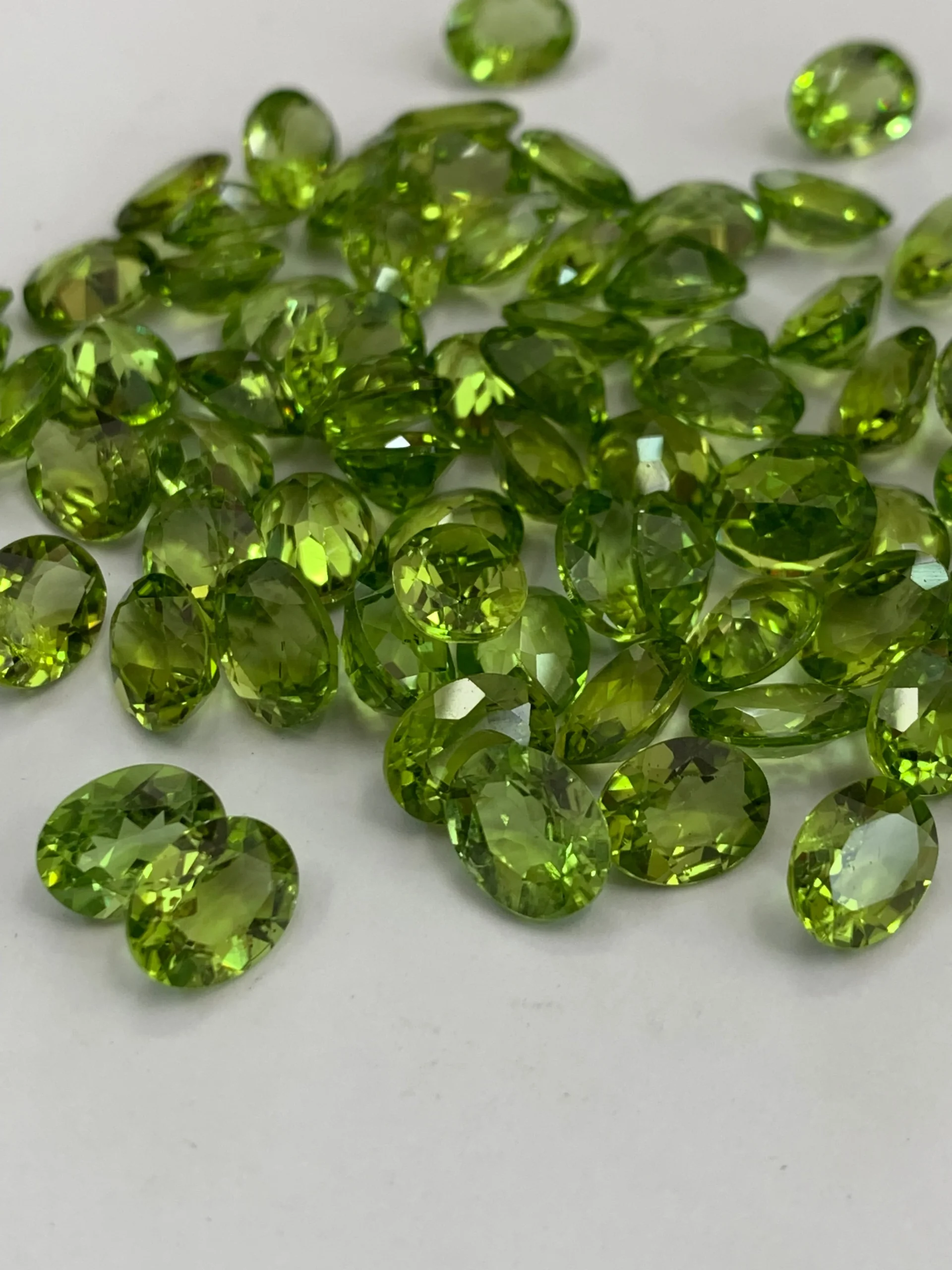 A stunning Oval Cut Peridot gemstone featuring a vibrant green hue and brilliant facets that enhance its natural sparkle. The classic oval shape adds elegance and versatility, making it perfect for rings, pendants, and statement jewelry pieces.