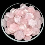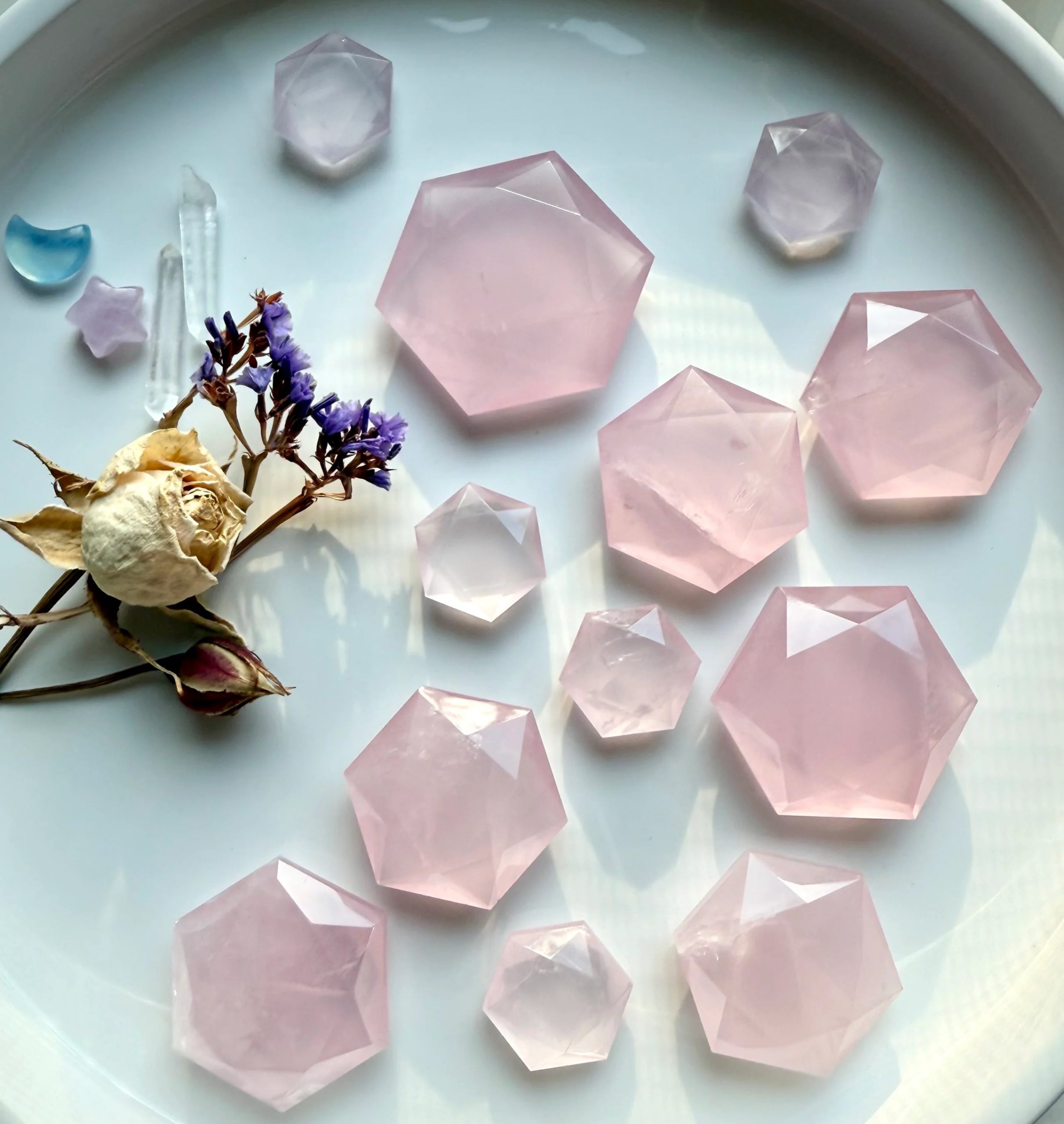 A beautiful Hexagon Cut Rose Quartz gemstone featuring a soft pink hue and precisely faceted surface that enhances its natural sparkle. The unique hexagon shape adds a modern and elegant touch, making it perfect for rings, pendants, and statement jewelry pieces.