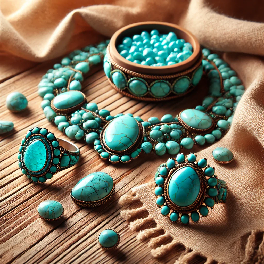 A stunning set featuring a necklace, matching ring, and earrings, showcasing the natural blue-green beauty of Turquoise. Perfect for custom jewelry, each piece comes with certification and guaranteed resell value.